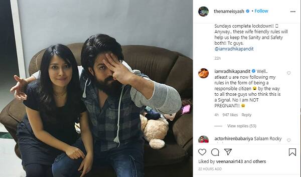 "Karnataka Government has set new lockdown rules and don't know why, seems like my wife had something to do with it! Back home at 8pm everyday and Sundays complete lockdown!! Anyway.. these wife friendly rules will help us keep the Sanity and Safety both!! Tc guys. @iamradhikapandit," he captioned the image. Talking about the post, the picture has Radhika and Yash sitting on the couch with the actor has touched his first three fingers on his forehead. Have a dekko here: